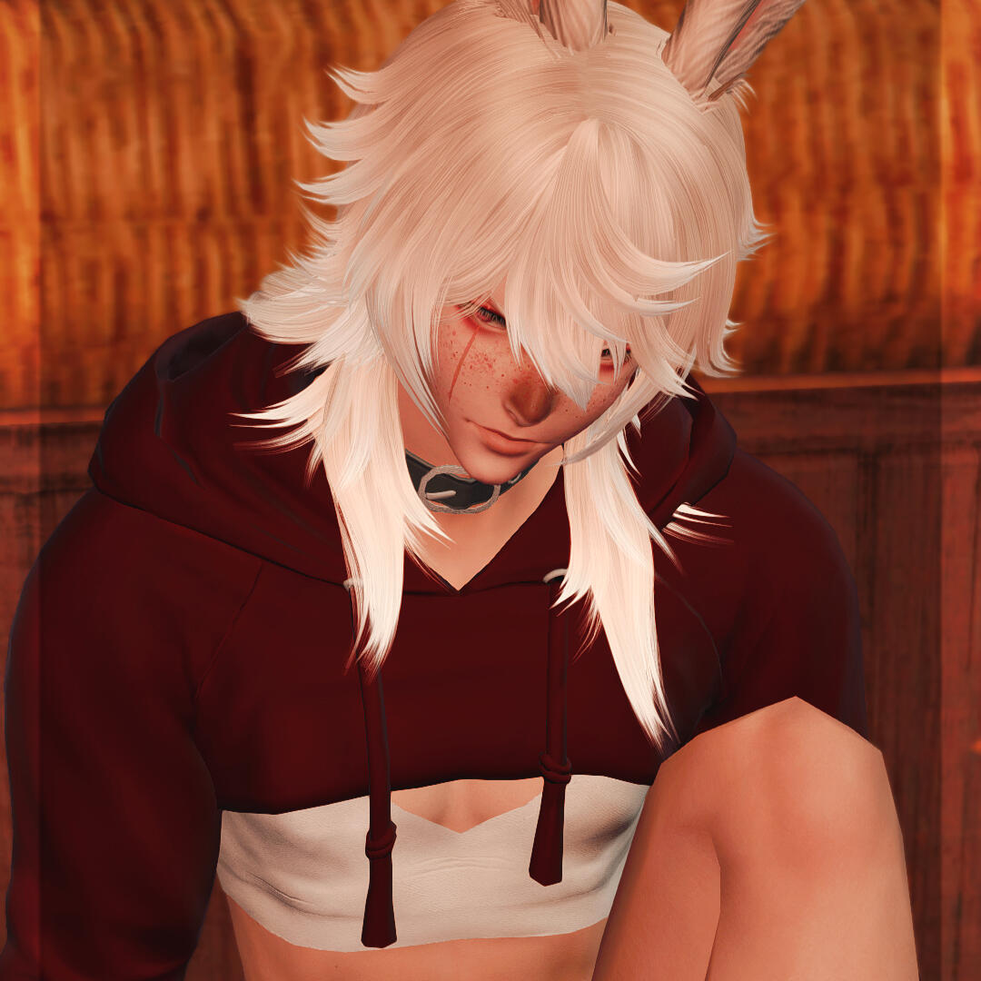 NOTABLE FEATURES. Absolutely covered in freckles. Has a short fluffy tail the length of a child miqo's tail. Has a scar over his right eye, a scar across his chest that looks like it never healed, another scar on his back and another scar under his tit. His right arm is a pale blue color, its cool to the touch as if it were made from stone. His gaze is striking in how he has perpetual resting bitch face.